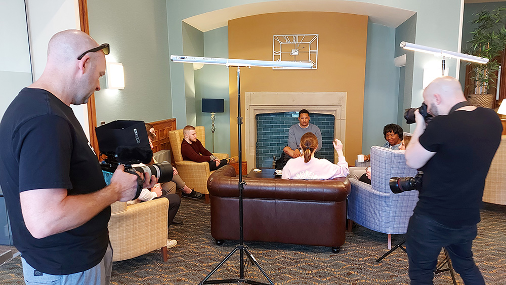 The day of filming started early by preparing the venue to make sure that each location was dressed correctly, staff were briefed, meals prepared, and the script was run through. At around 10 am the cast arrived. Many had worked together before and some met for the first time so they sat together in the lounge with a coffee to get to know each other. This gave us a great opportunity to film them naturally. Many of the shots you see in the advert were simply taken of the cast chatting amongst themselves.