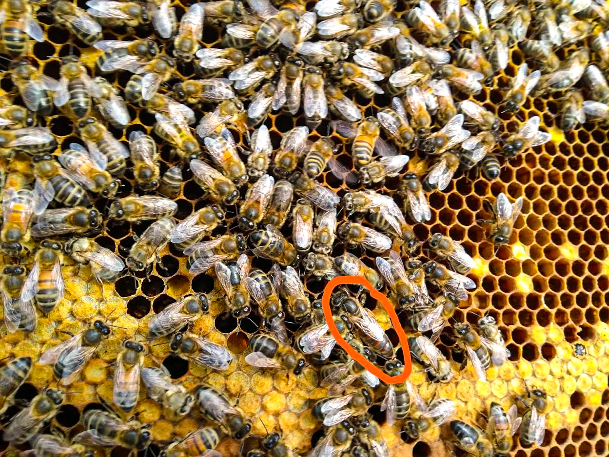 The queen bee surrounded by her workers.