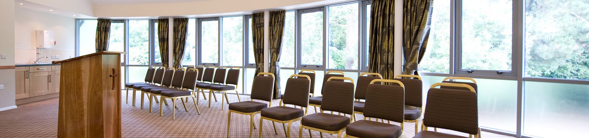 The room is equipped with a lectern, 2 LED screens, microphones, a mixing desk, induction loop and a Yamaha digital piano.