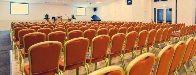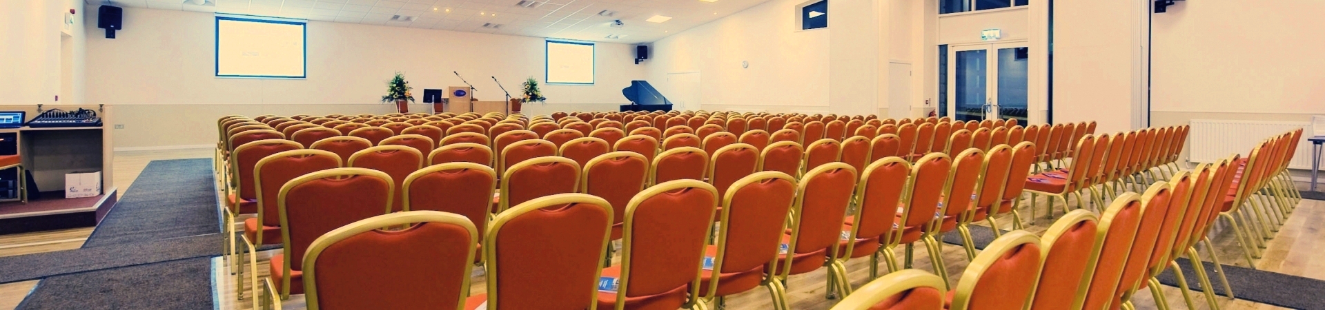 The hall is equipped with two 86-inch screens on both sides, Airtame 2, microphones, mixing desk, induction loop and a grand piano.